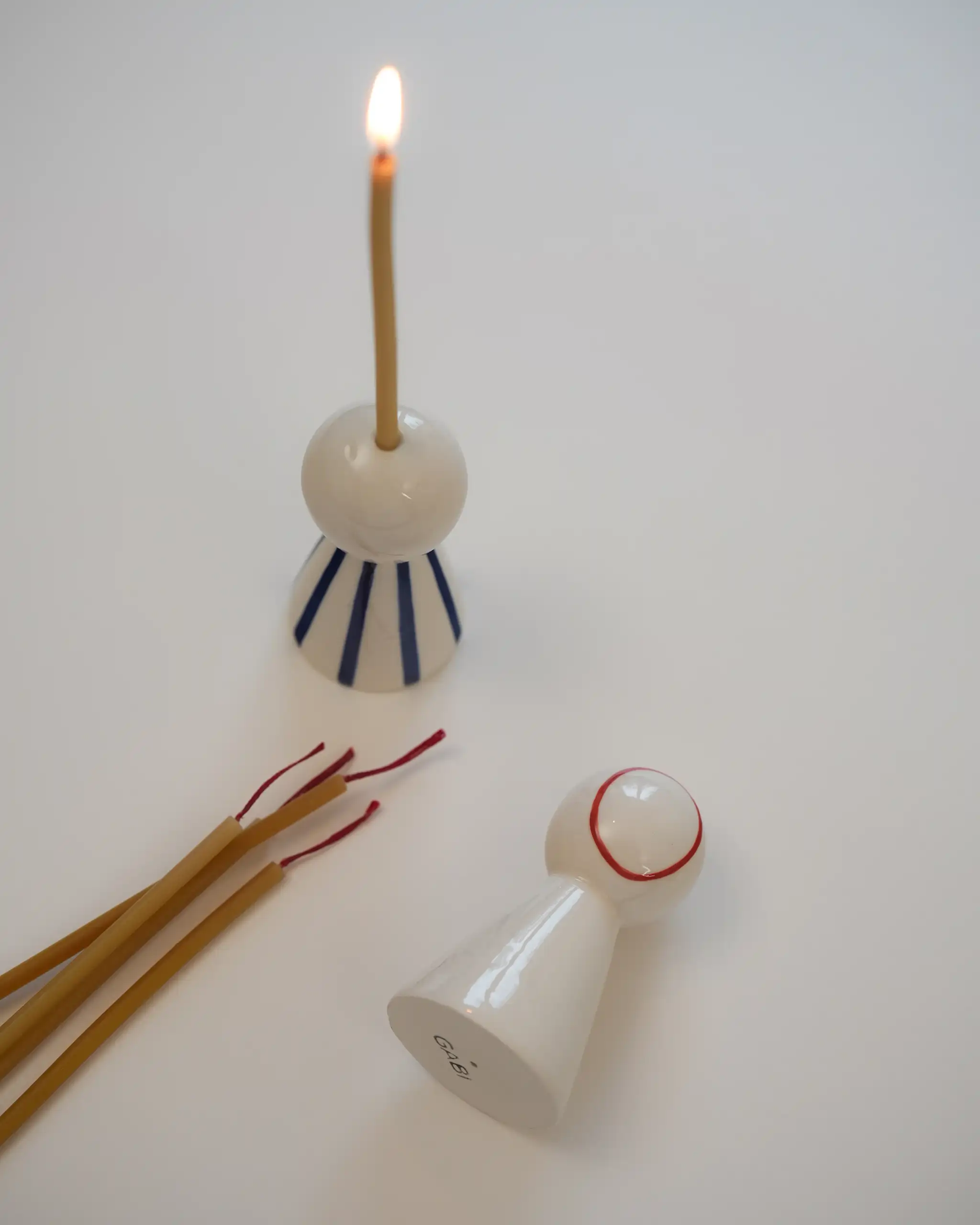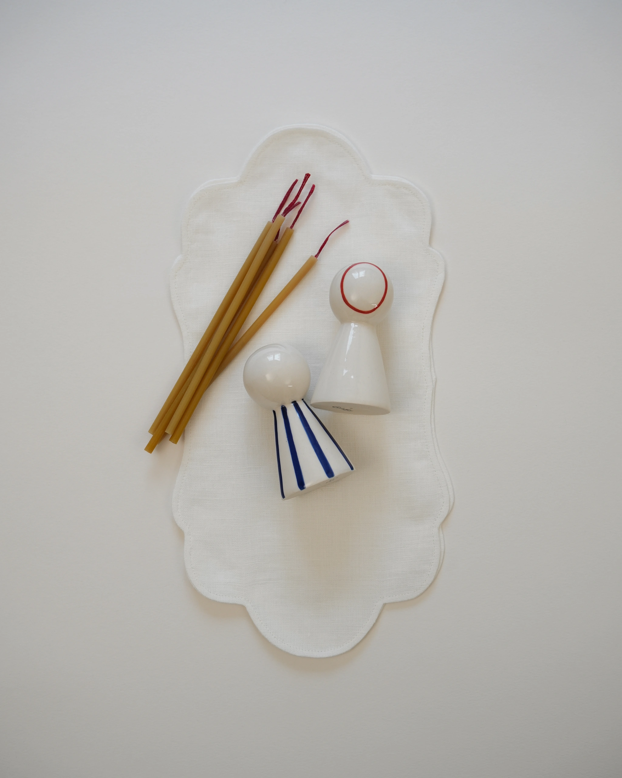Состав: фигурные салфетки из умягченного льна, 12х25 см, 2 шт; керамические парные подсвечники Друзья; свечи тонкие из натурального воска с красными фитилями, 5 шт.